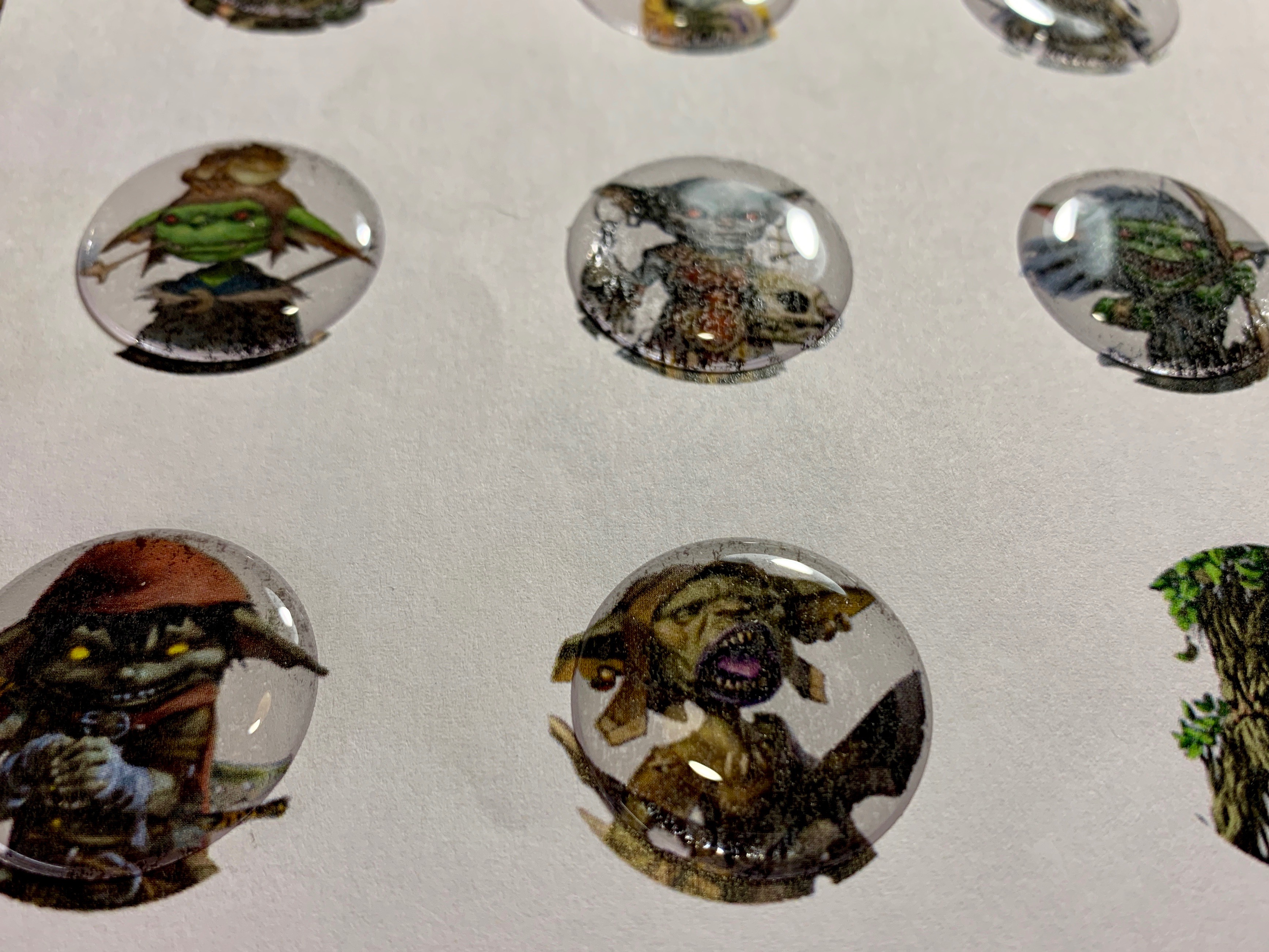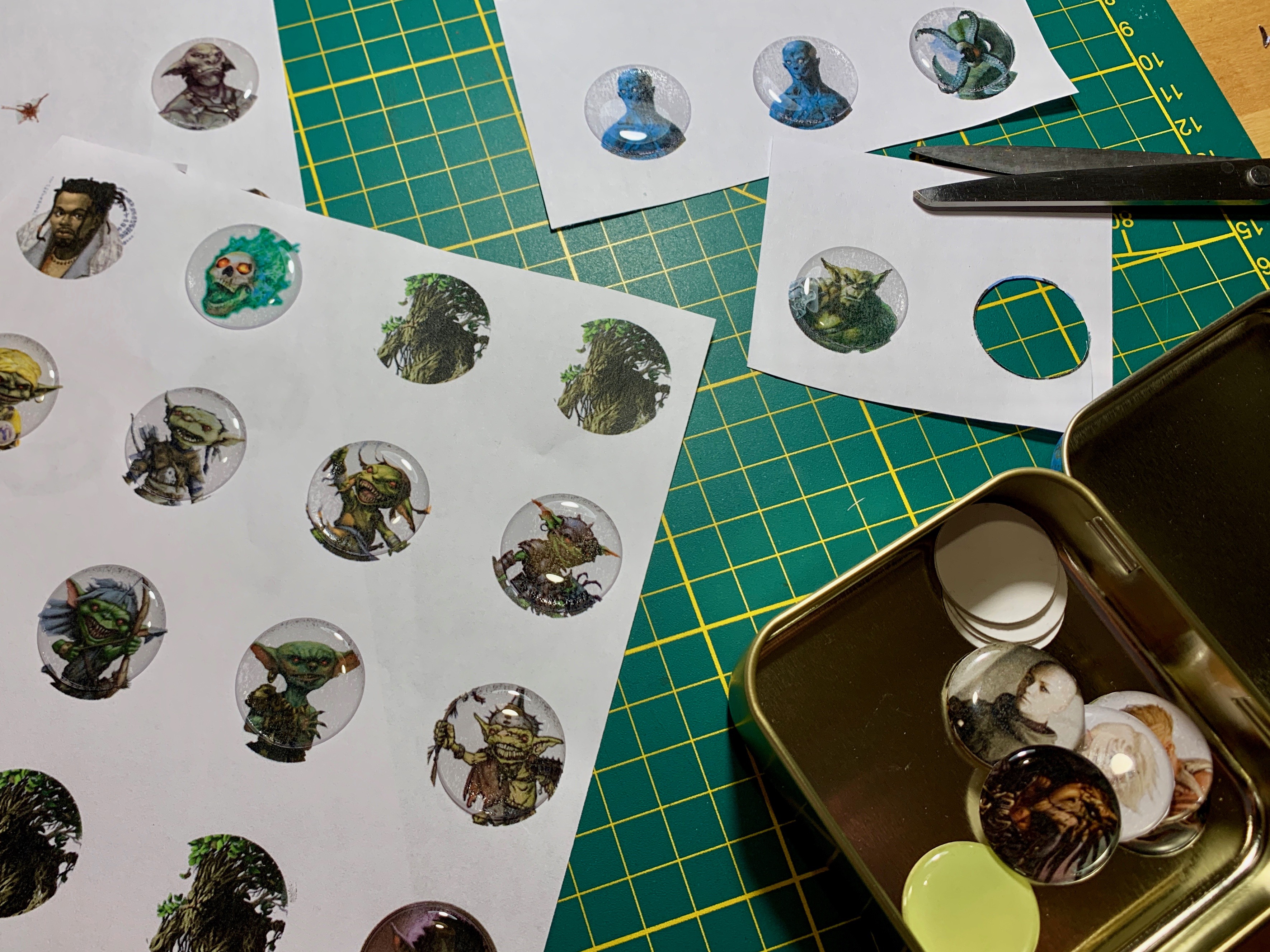 Après un ou deux essais d’impression à taille réelle, il s’agira ensuite simplement de coller les pastilles sur les portraits et de les découper, aux ciseaux et/ou à l’emporte-pièce. J’ai doublé les jetons des héros par une deuxième cabochon au verso pour les repérer sur le plateaux de jeu.
