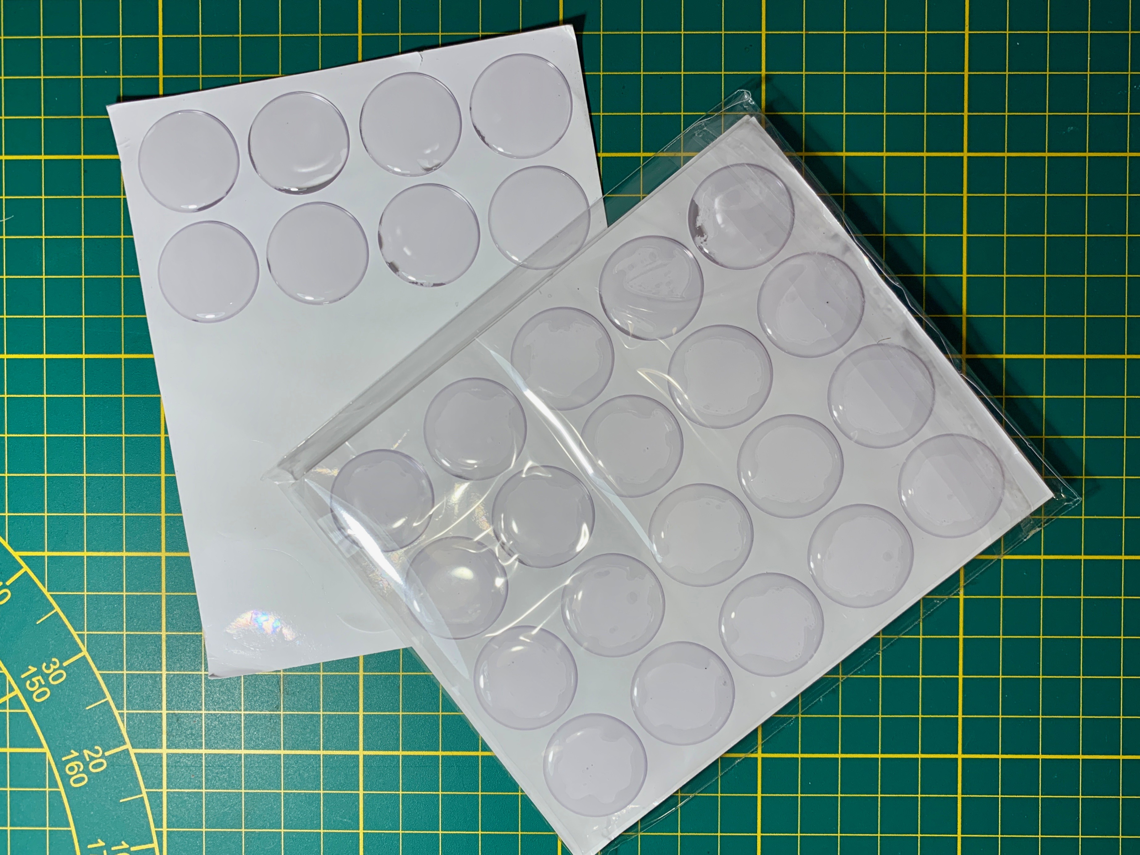 J’ai trouvé des cabochons adhésifs sur Amazon (bouh, je sais, cémal) en silicone, de 2,5 cm pour les créatures de taille Moyenne et 5 cm pour les créatures de taille Grande.